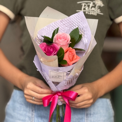 Arranjo encantador e vibrante composto por 3 rosas em cores variadas, criando uma composição alegre e cheia de personalidade. As flores são harmonizadas com folhagens verdes e envolvidas em embalagem requintada, finalizadas com fita de cetim que confere elegância ao conjunto.
