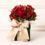 Arranjo romântico e clássico composto por 3 rosas vermelhas, harmonizadas com folhagens verdes que realçam a intensidade e o brilho das flores. A composição é envolvida em embalagem requintada, finalizadas com fita de cetim, criando uma apresentação delicada e elegante.